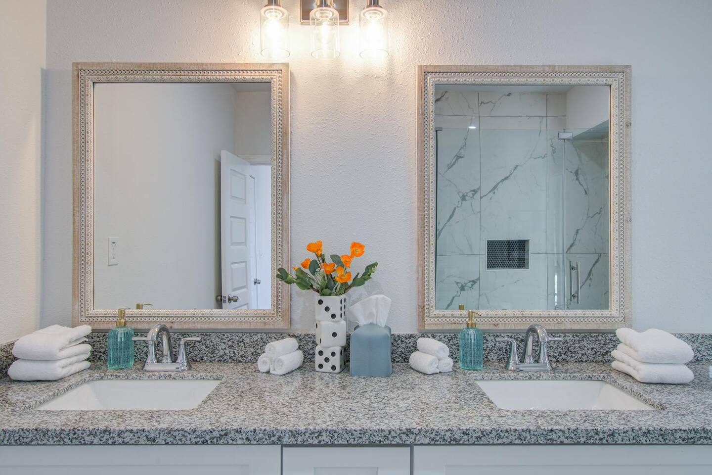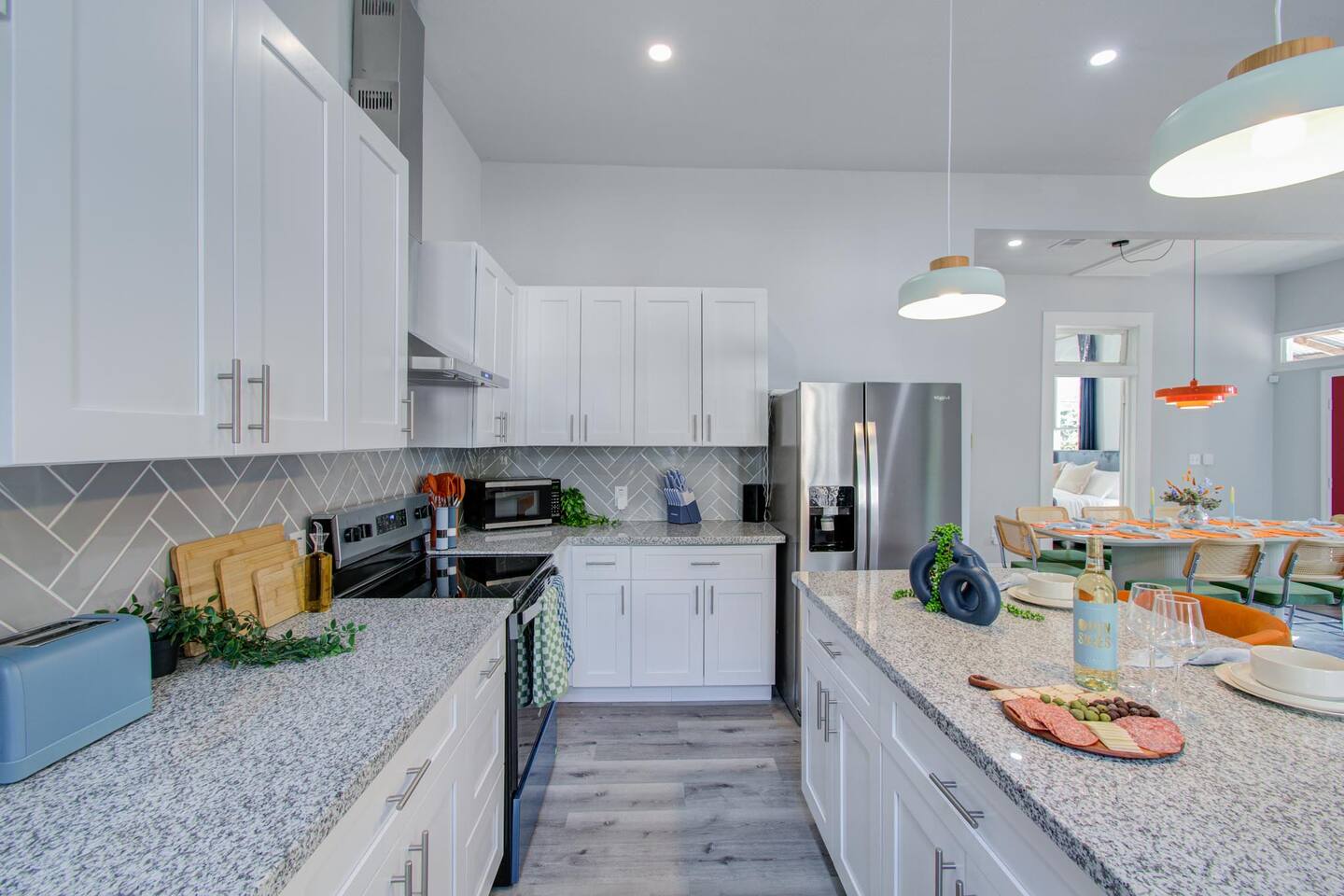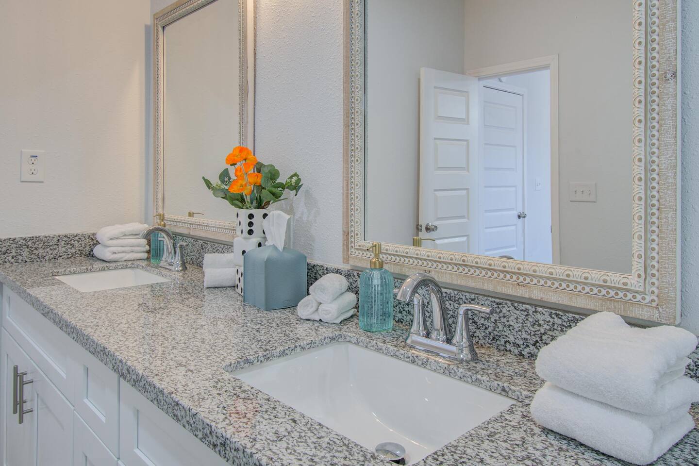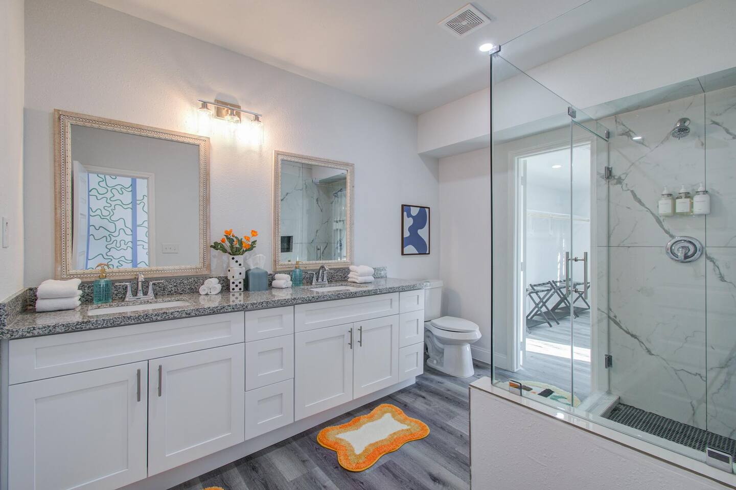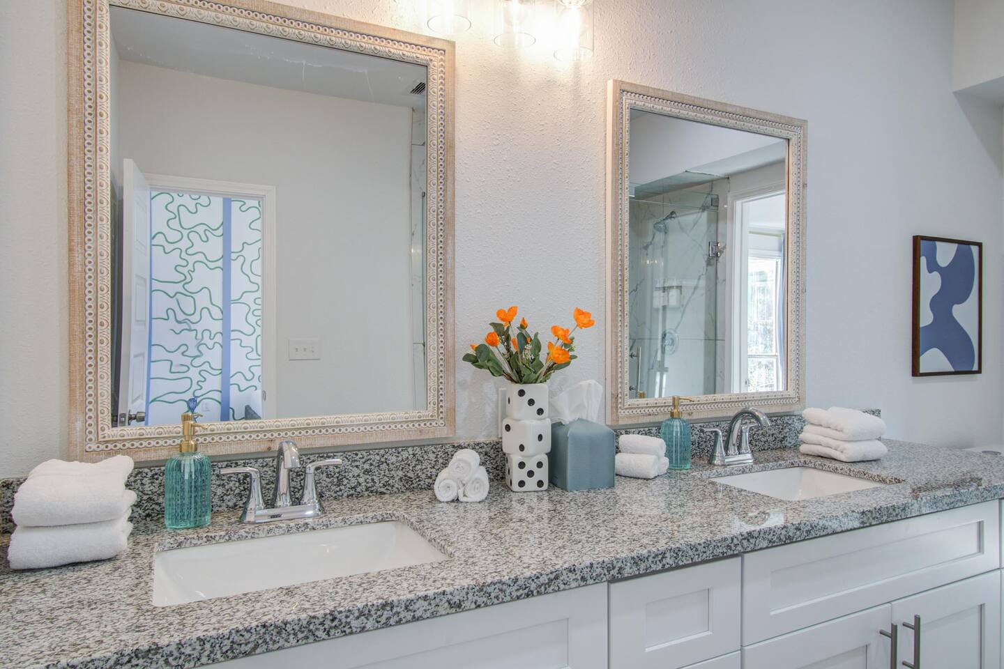 ποΈ 3 bedrooms with 4 total beds for flexible sleeping arrangements π Primary suite features 2 queen beds ποΈ Additional bedrooms include 1 king bed and 1 queen bed πΏ 2.5 bathrooms for convenience and easy group use π Primary suite bathroom features dual sinks with a separate walk-in shower π½οΈ Dining table for 8 with open layout for meals, work, or games π Spacious design balancing shared spaces and privacy